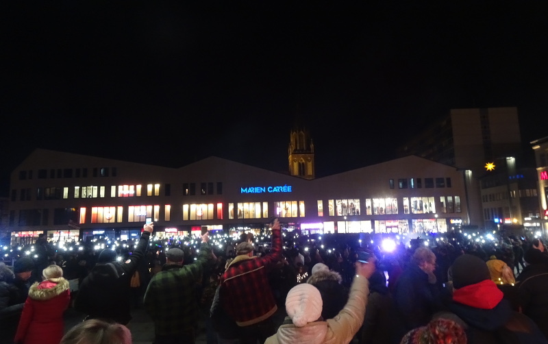 Auch in der 2. Kalenderwoche des Jahres 2022 spazierte eine gewaltige Menge gegen Corona Impfzwang und unverhältnismäßige Corona-Maßnahmen. Während im alten Jahr die zwei Glühweinbuden geschlossen wurden(Demoauflage war Alkoholverbot), führte man heute Brandschutzauflagen ins Feld, um den Bürgern den Zutritt zur großen HKB-Freitreppe zu verwehren. Der Eigentümer Neuwoges genehmigte nur den Künstlern und Veranstaltern (insgesamt sollten wohl max. 6 Personen auf der Treppe stehen dürfen), die Treppe zu nutzen. Was man bei herumlungernden, grölenden und trinkenden Personen über viele Jahre mit Ordnungsamt, Polizeikräften und diversen Anzeigen nie richtig in den Griff bekam, war am heutigen Abend ohne exekutiven Druck problemlos möglich: Die Spaziergänger hielten sich ohne zu murren an das Betretungsverbot!…. War nicht auch der HKB- Umbau ein Grund dafür, dass sich Neubrandenburg seinerzeit völlig überschuldete und sind es im Endeffekt nicht die Neubrandenburger Bürger und Spaziergänger, welche die Zeche dafür zahlen und nun nicht auf die Treppe dürfen ? Doch zurück zum Geschehen! Zum heutigen Montagsspaziergang gehörte eine Umfrage und eine Zählung; beides unter Aufsicht eines ungenannten Nordkurier-Reporters. Wer es war, kann ich zum Zeitpunkt des Redaktionsschlusses nicht 100%ig sagen. Ich meine jedoch den Nordkurier-Chefreporter Beigang mit seiner großen Arbeitstasche auf dem Marktplatz gesehen zu haben. Herr Beigang, berühmt für seine guten Gerichtsreportagen und spannenden Kriminalakten-Romane, ist so gesehen für diese „notarielle“Aufgabe sehr kompetent und vertrauenswürdig. Egal, wie sein Bericht ( oder die seiner Kollegen) ausfallen wird-ich bin auf die Dienstagsausgabe des Nordkuriers gespannt. Unsere Ministerpräsidentin Frau Schwesig wurde von den Spaziergängern auf den Neubrandenburger Marktplatz offiziell eingeladen- schade, sie kam nicht, machte sich kein unabhängiges Bild und nahm die Gelegenheit nicht wahr, mit den Bürgern in einen Dialog zu treten. Unter tosendem Beifall der Menge ging deshalb der Ministerpräsidentin-Blumenstrauß an eine mutige Ärztin, die den Strauß stellvertretend für viele anwesende Mediziner und Pfleger mit einem sehr sympathischen Lächeln glücklich in ihre Arme schloss. Sehr viele Spaziergänger hofften auf OB Silvio Witt, doch auch von Ihm und einem angedeuteten Treffen mit den Spaziergänger- Organisatoren hörte man 6 Tage vor der nächsten Oberbürgermeisterwahl nichts. Bewegend war der Moment, als unzählige Lichter den Marktplatz erhellten. Zu Beginn des Spazierganges gaben viele Menschen ihren Umfrage-Zettel ab und gingen danach durch ein Spalier von Klick-Zählern. Eine erste amtliche Zahl wurde übers Mikrofon verlautbart: 1800 Teilnehmer ließen sich zählen. Ich persönlich schätze auf Grund dieser amtlichen Zahl mindestens 2000 Teilnehmer, denn nicht jeder Demonstrant beteiligte sich an dieser Aktion, nicht jeder gab einen Zettel ab. Hinzu kamen 100 Ordner…. auch eine hohe Hürde und Demonstrationsauflage! Es ist nicht damit getan, sich als Ordner zu melden, sondern die Polizei nimmt auch aus organisatorischen Gründen die Ordner-Personalien auf. Für die Verteilung der Umfragezettel waren zusätzlich viele emsige Helfer unterwegs. Die Spaziergänger-Route führte heute über Dümperstraße, Wollweberstraße, Schiller- und Lessingstraße bis zur Lohmühle und durch das Stargarder Tor zurück auf den Marktplatz. Die Polizei verdient an diesem Abend auch ein großes Lob- die Beamten haben die Demonstration sehr professionell begleitet und geschützt.